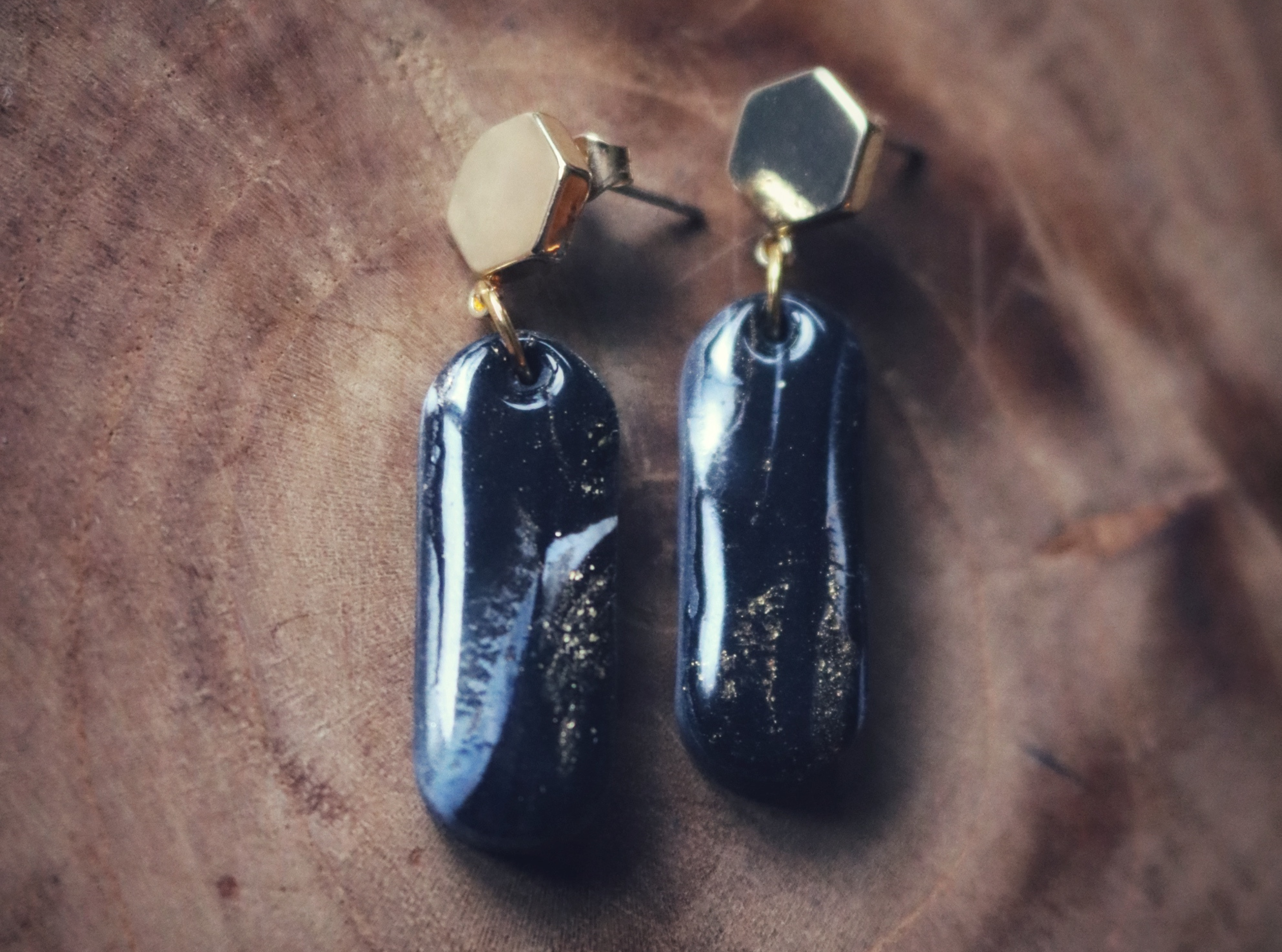 Ze zijn gemaakt van de beste kwaliteit polymeer klei en goudfolie en afgewerkt met een laagje resin zodat ze nog langer mooi blijven. De oorstekers zijn van roestvrij staal met een gouden topcoat.