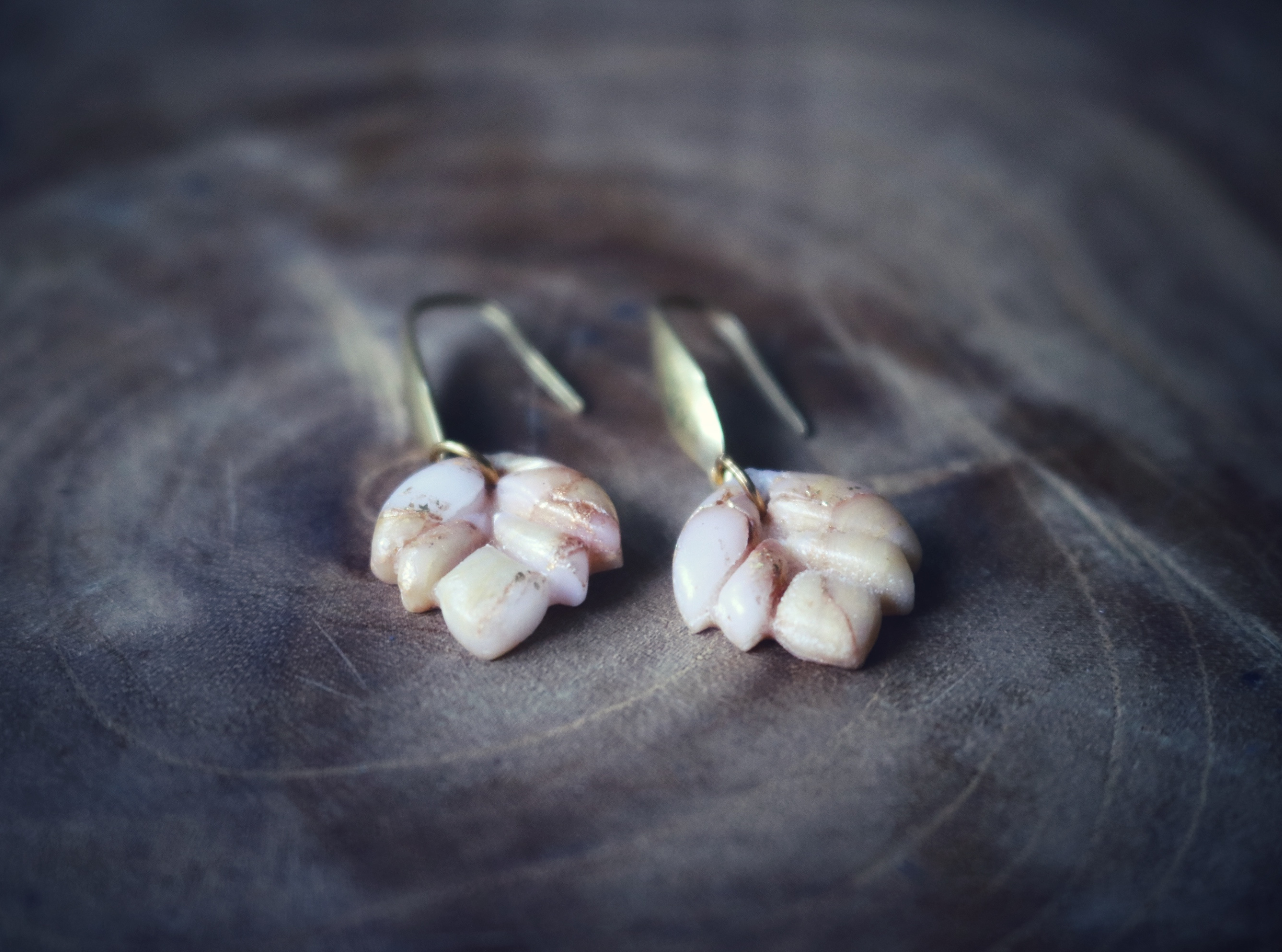 Ze zijn gemaakt van de beste kwaliteit polymeer klei en goudfolie en afgewerkt met een laagje vernis. De oorstekers zijn van roestvrij staal met een gouden topcoat.