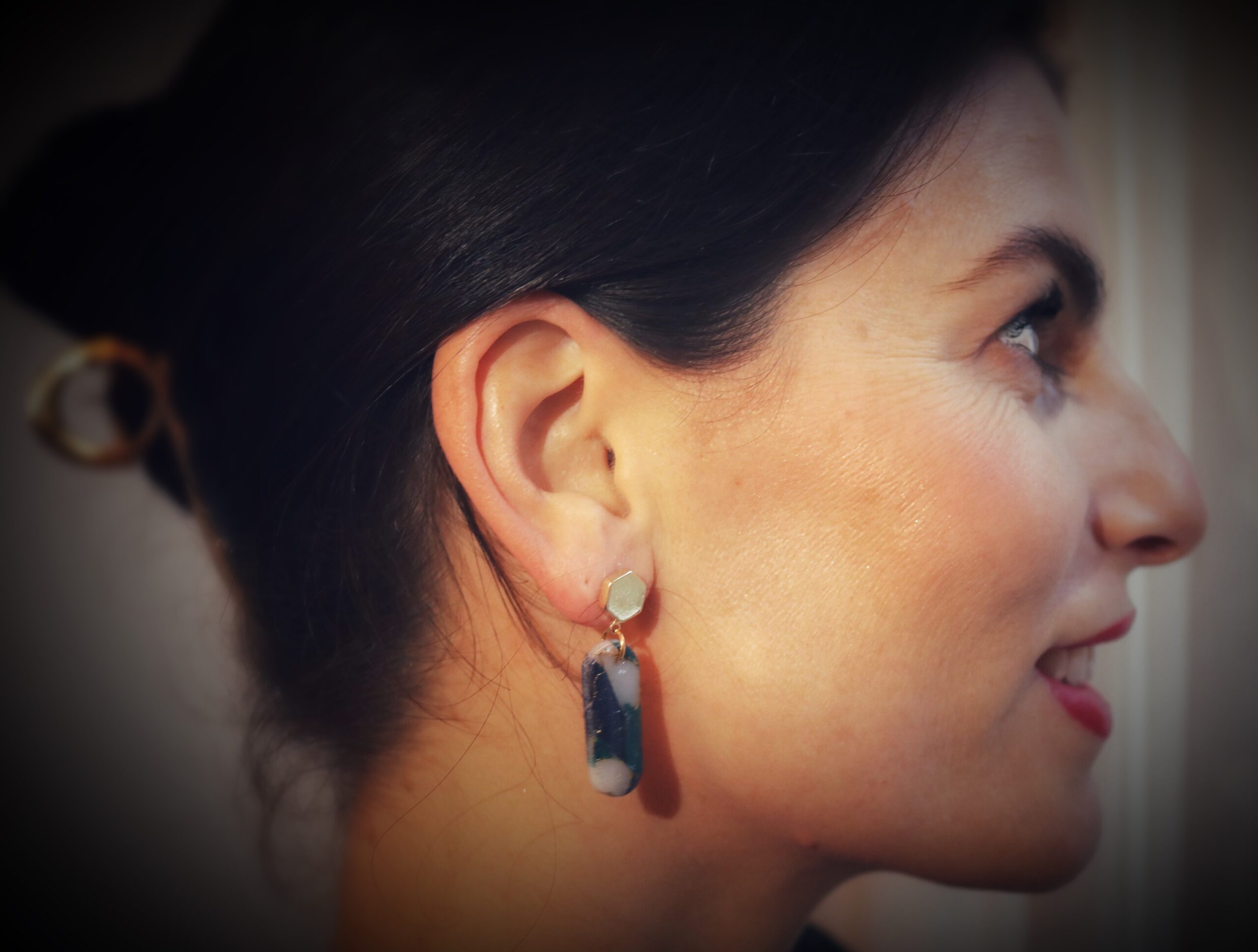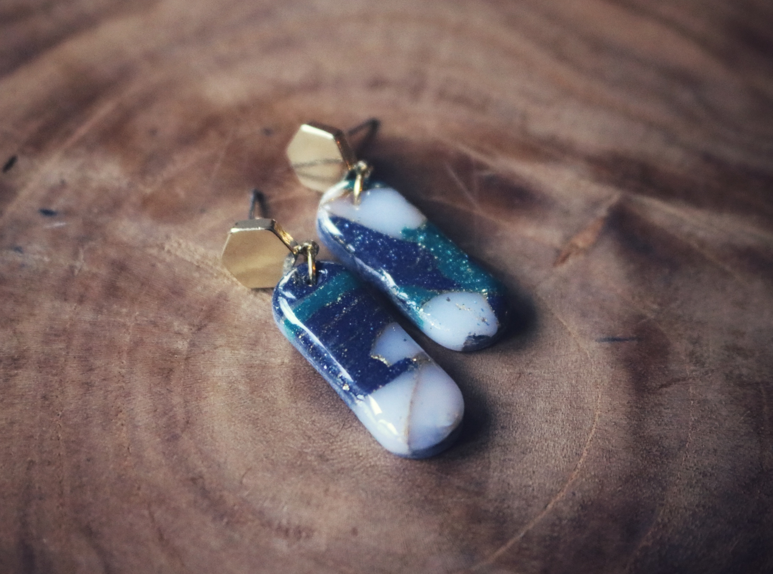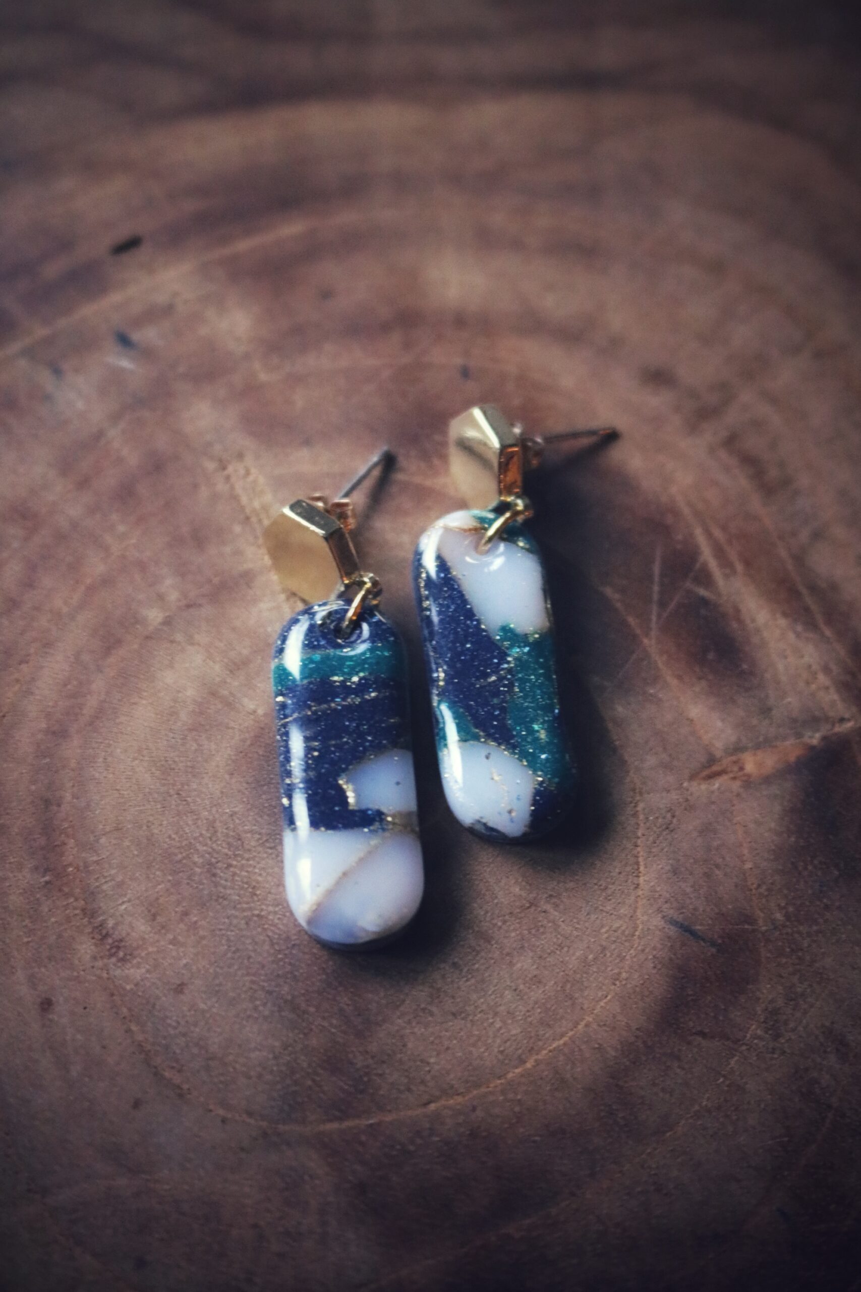 Deze oorbellen zijn onderdeel van de Marble Azure Collection, een stijlvolle collectie met donkerblauw, turqoise, transparant-wit en goud elementen. Door de speciale Marble techniek krijgen ze een steen effect en een erg elegante uitstraling, perfect om te dragen op een feestje of naar het theater!